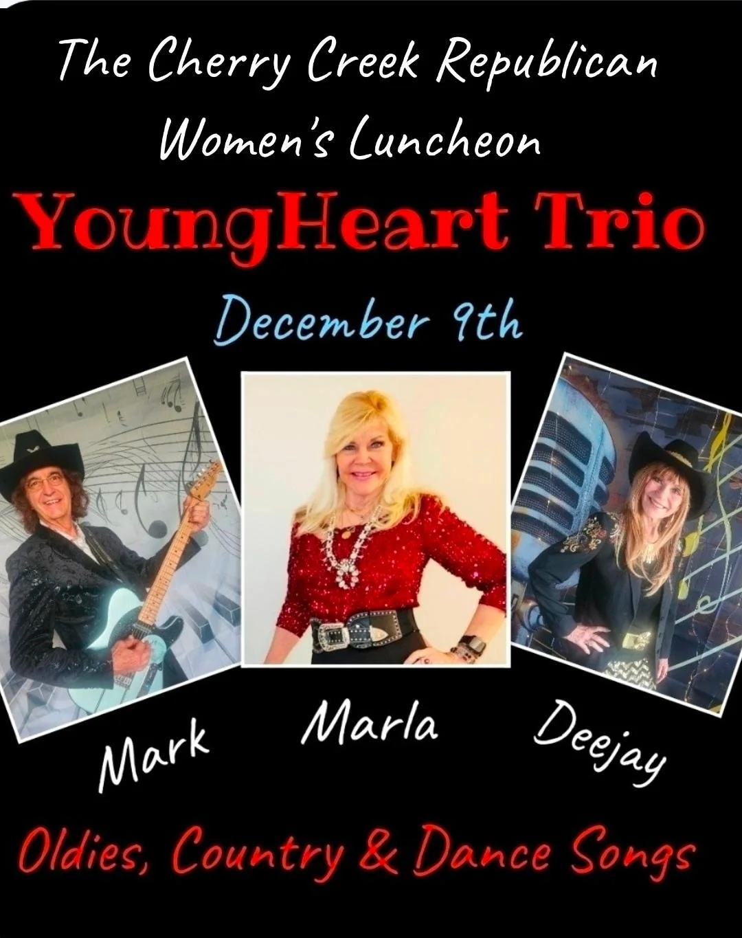 We are excited to have the YoungHeart Trio to celebrate the holiday with CCRW. This entertaining group “Brings the Music and the Fun” with oldies, country and holiday music and with some great talent…Marla Downer, 2018 Colorado Country Music Hall of Fame Female Vocalist of the Year and DeeJay, 2019 Female Vocalist and Entertainer of the Year.